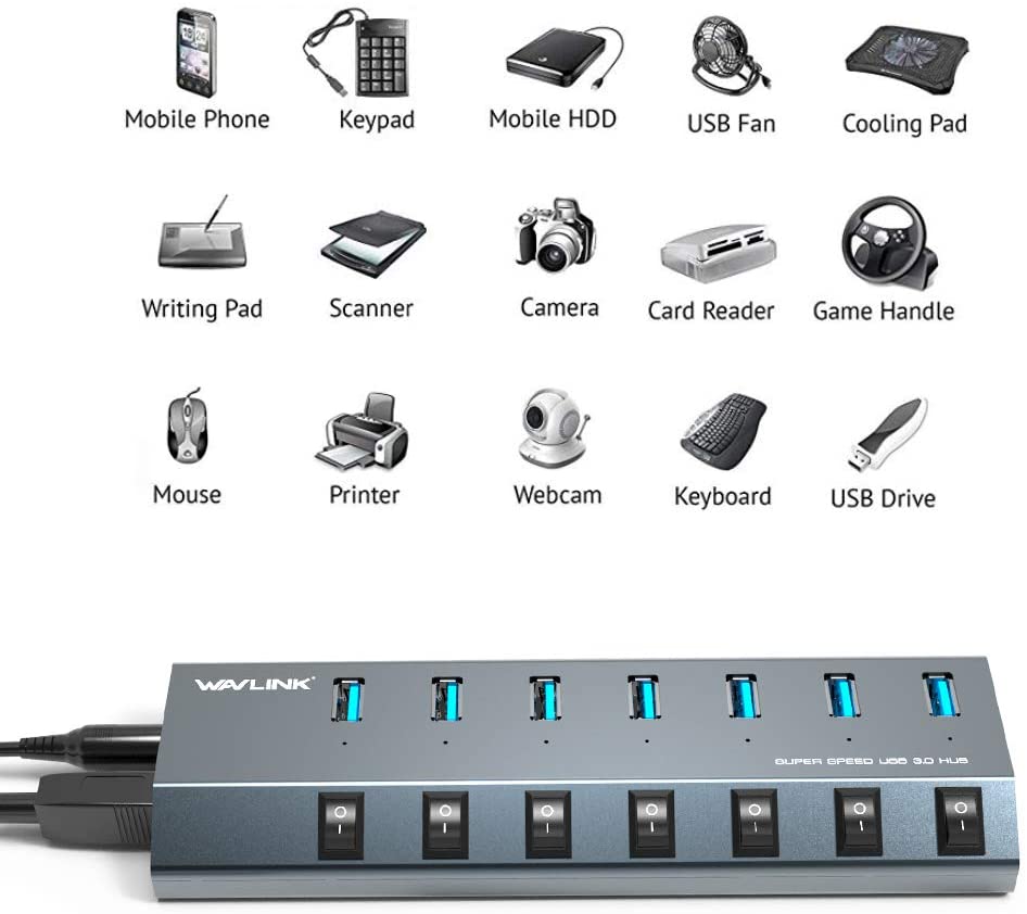 - 【5Gbps Data Transfer】7 Super speed USB 3.0 ports support transfer speed of up to 5Gbps, transferring HD movies / large data in no time. Backward compatible with USB 2.0/1.1.