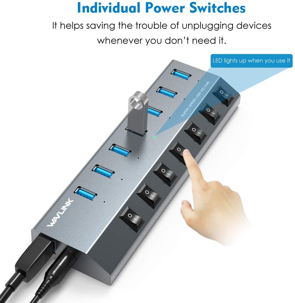 - 【Solid Performance】Featured with sturdy and well-built quality, each port has its own ON/OFF switch so you don’t need to unplug the devices every time you finish using. Hot-Swapping supported. 7-in-1 design, no more clutter on the table.