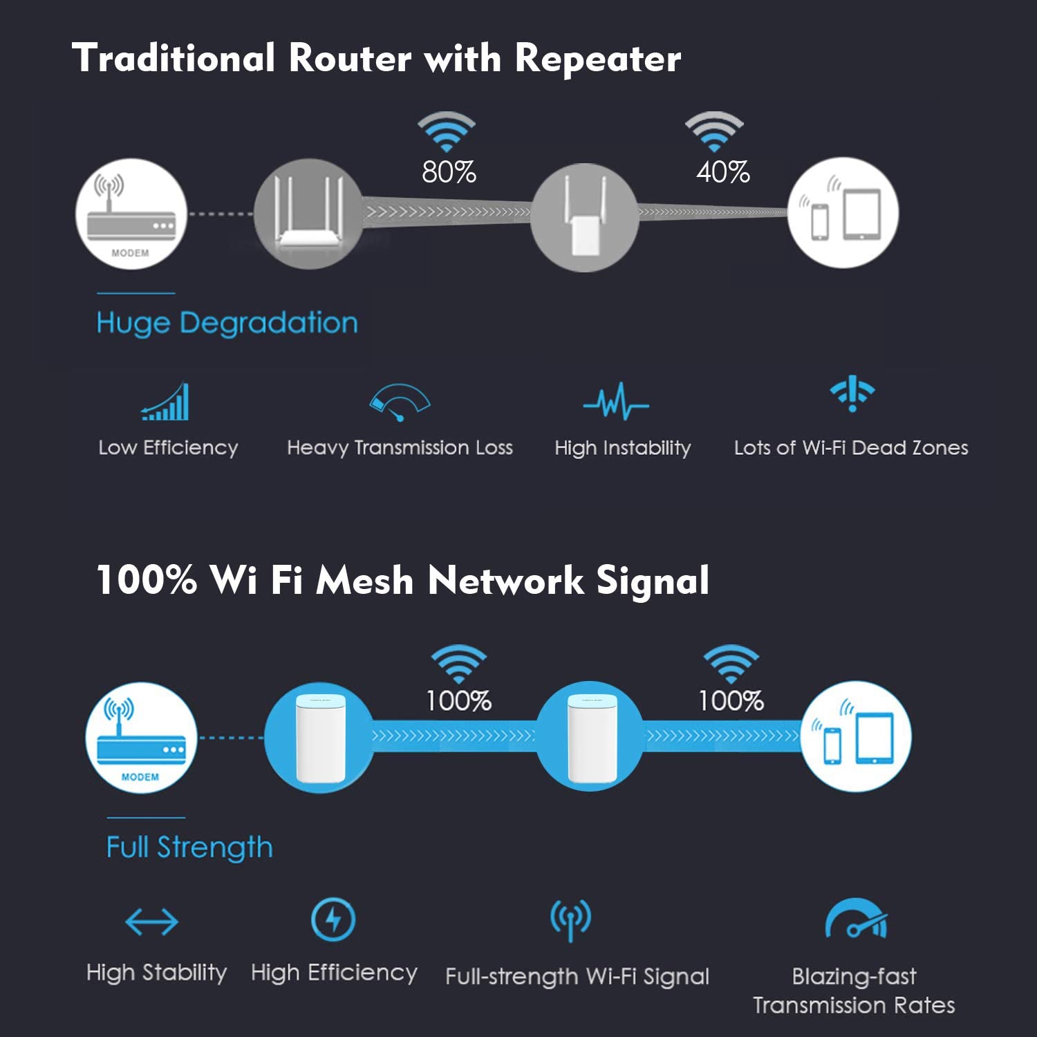 - 【Easy Setup】Mesh WiFi System chooses the fastest path for device connections and keeps your network running as fast as possible.Easy setup assistant with multi-language support provides a quick & hassle-free installation process.7×24 online customer support, any problems please contact us at any time: -)